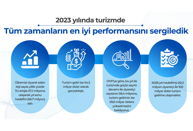 "Turizm geliri ise 54,3 milyar dolar olarak gerçekleşti. Orta Vadeli Program'a göre bu yıl da turizmde güçlü seyrin devamıyla ziyaretçi sayısının 59,4 milyona, turizm gelirinin ise 59,6 milyar dolara yükselmesini bekliyoruz. 2028 yılı hedefimiz 82,3 milyon ziyaretçiyle 100 milyar dolar turizm gelirine ulaşmaktır."